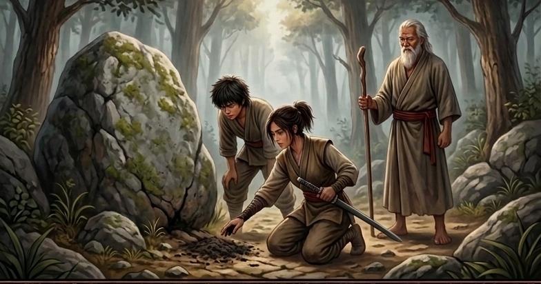 Sekar Laras berjongkok, menyentuh tanah di dekat sebuah batu besar.