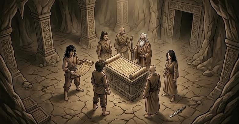 Di dalam, kapal terasa sempit dan penuh simbol-simbol aneh di dinding. Beberapa lampu minyak menerangi ruangan, menyorot gulungan-gulungan dan kotak kayu yang ditumpuk rapi. Jaka menahan napas. Energi gulungan kuno yang mereka bawa terasa beresonansi dengan simbol di kapal ini.