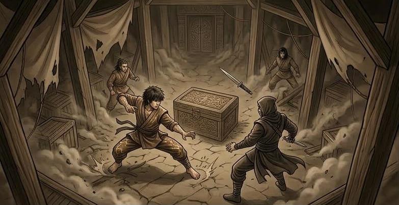 Lampu minyak bergetar, bayangan menari liar di dinding, gulungan kuno berdesir seolah ikut menyaksikan pertarungan yang semakin memuncak.
