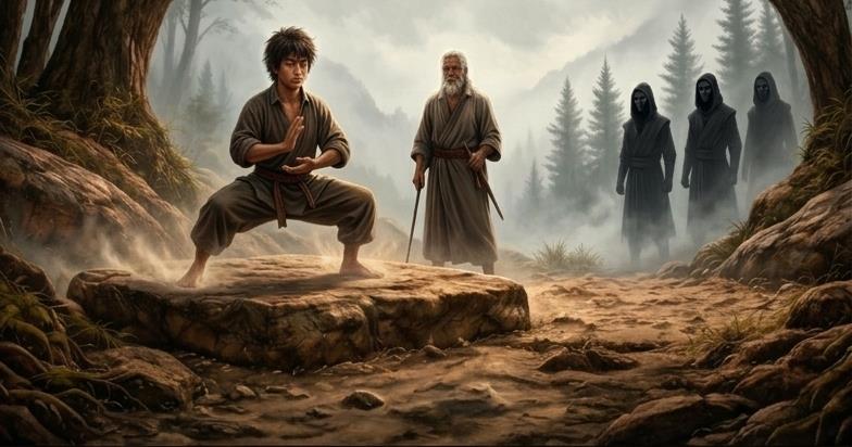 Di sebuah dataran kecil yang dikelilingi batu besar, seorang pemuda berdiri dalam posisi kuda-kuda rendah.